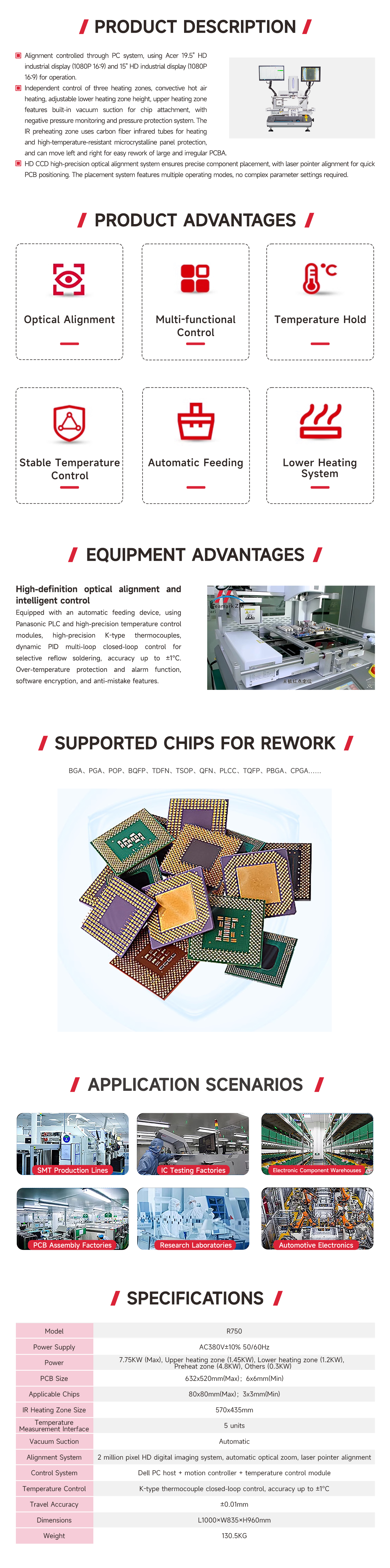 Alignment is performed through a PC control system, using a 19.5-inch high-definition industrial display screen and a 15 inch high-definition industrial display screen for operation. Independently controlled three temperature zones, heated by convective hot air, with adjustable height in the lower temperature zone and built-in vacuum suction tube in the upper temperature zone for BGA adsorption, it is equipped with negative pressure monitoring and pressure protection device; The IR preheating temperature zone adopts carbon fiber infrared tube heating and high-temperature resistant microcrystalline panel protection, which can be moved left and right for easy maintenance of large and irregular PCBA. Adopting a high-definition CCD high-precision optical alignment system, it can ensure the precise placement of components. Equipped with laser red dot positioning, it guides the rapid positioning of PCBs. The placement system adopts multiple working modes, without the need to set complex locking parameters.