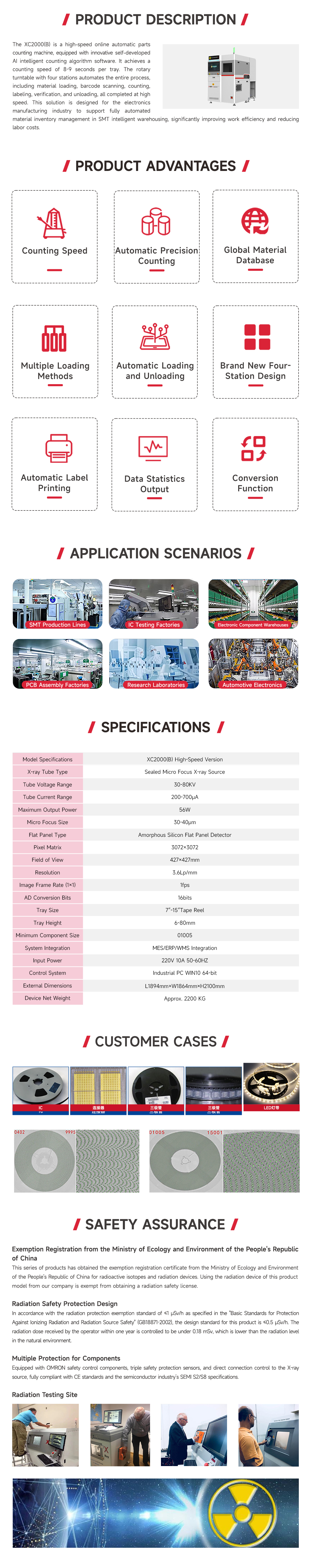 XC2000 (high-speed version) is a high-speed inline automatic counting machine with innovative self-developed Al intelligent counting algorithm software, a counting speed of 8-9 seconds/tray, and a turntable with four working positions to achieve automatic loading, code reading, counting, labeling, review and unloading at high speed. lt is designed for the electronics manufacturing industry to help SMT smart warehousing realize fully automatic material counting, which can greatly improve work efficiency and save manpower investment.