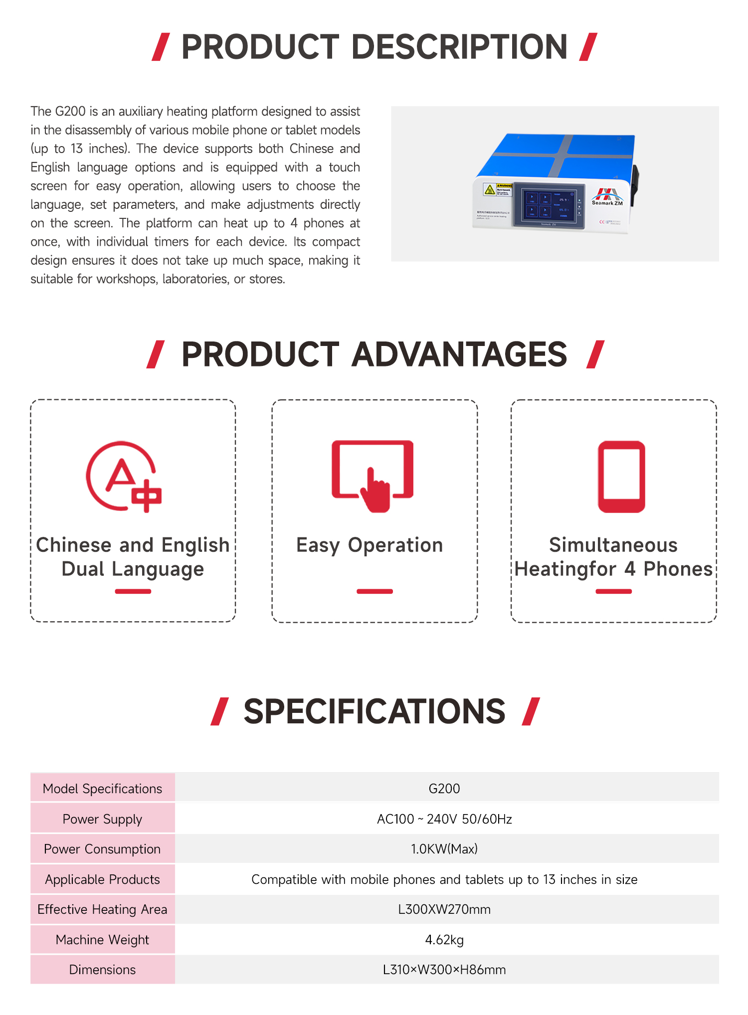 ZM-G200 auxiliary disassembly heating platform is a platform designed to assist in disassembling and heating multiple models (under 13 inches) of mobile phones or pads; This device is compatible with both Chinese and English languages; For the convenience of user operation, the device is equipped with a touch screen, and language selection, parameter setting, and adjustment can all be completed on the touch screen; This platform can heat up to 4 phones at once, and they are heated separately by timing; The device is lightweight and does not take up too much space, with a total weight of 4.62KG, suitable for use in workshops, laboratories, or stores.