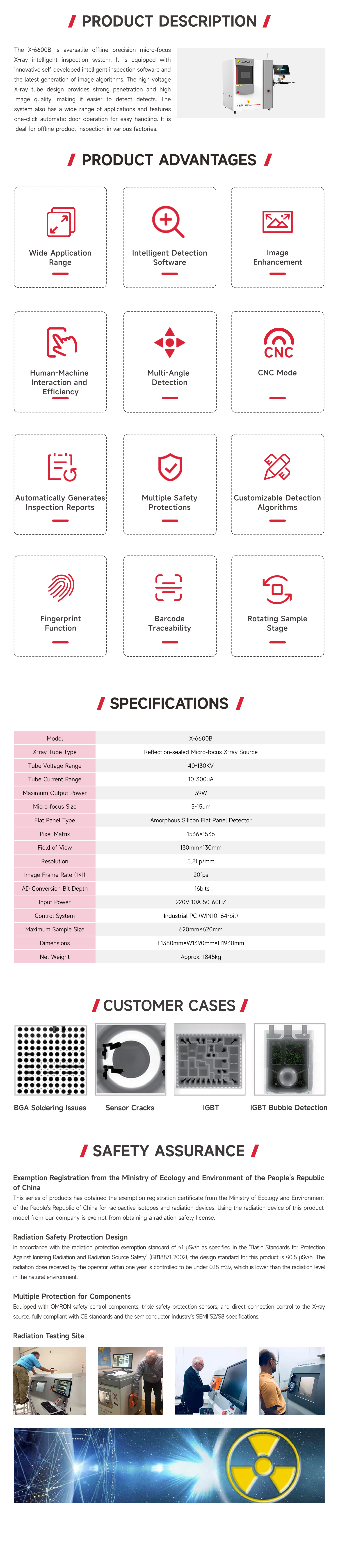 X6600B is a universal offline precision micro-focus X-ray intelligent inspection equipment, equipped with innovative self-developed intelligent inspection software and a new generation of image algorithms. lt adopts a high-voltage X-ray tube design with strong penetration, high image quality, easy to find defects, and a wider range of applications. One-button automatic opening and closing of the