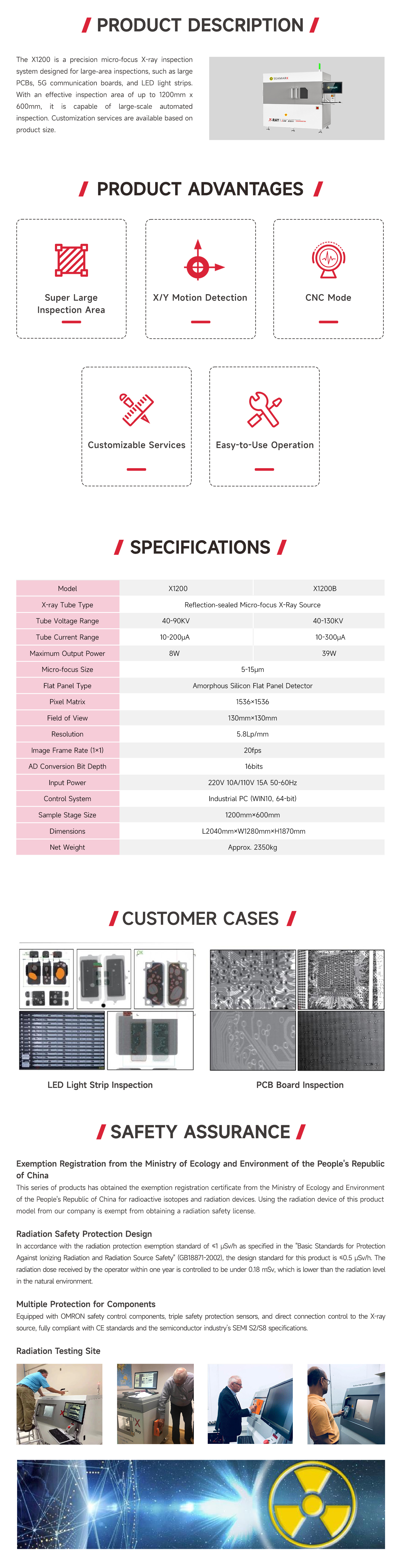 X1200 is a precision micro-focus X-ray inspection device for ultra-large area inspections such as large PCB boards, 5G communication motherboards, LED light strips, etc. lts effective inspection area can reach 1200mmx600mm,which can realize large-scale automatic inspection and accept customized services according to different product sizes.