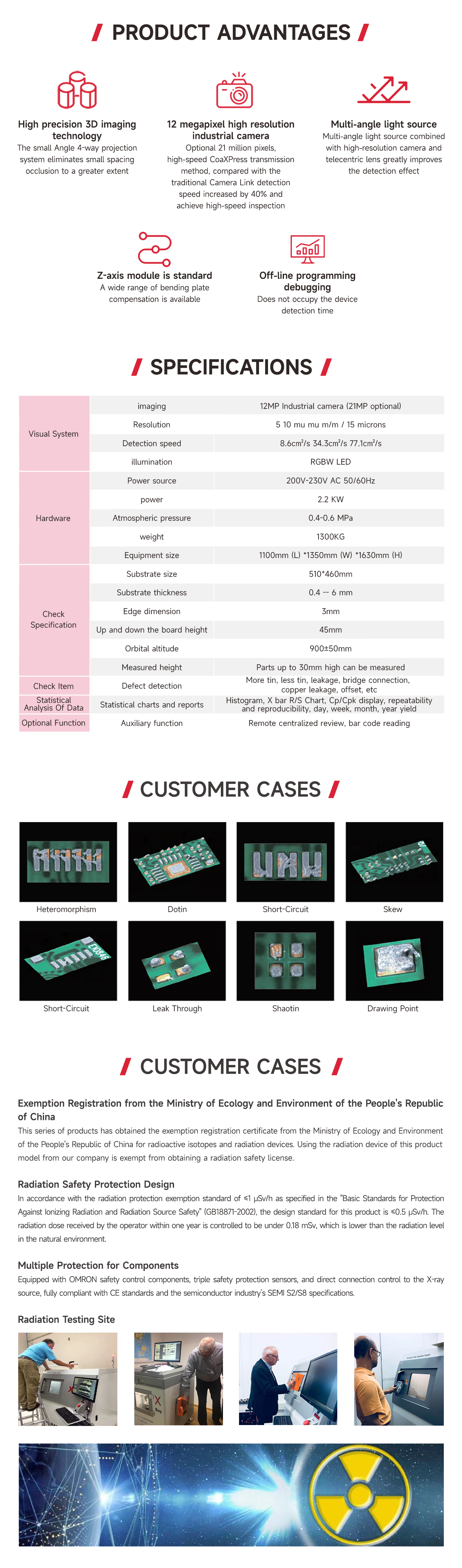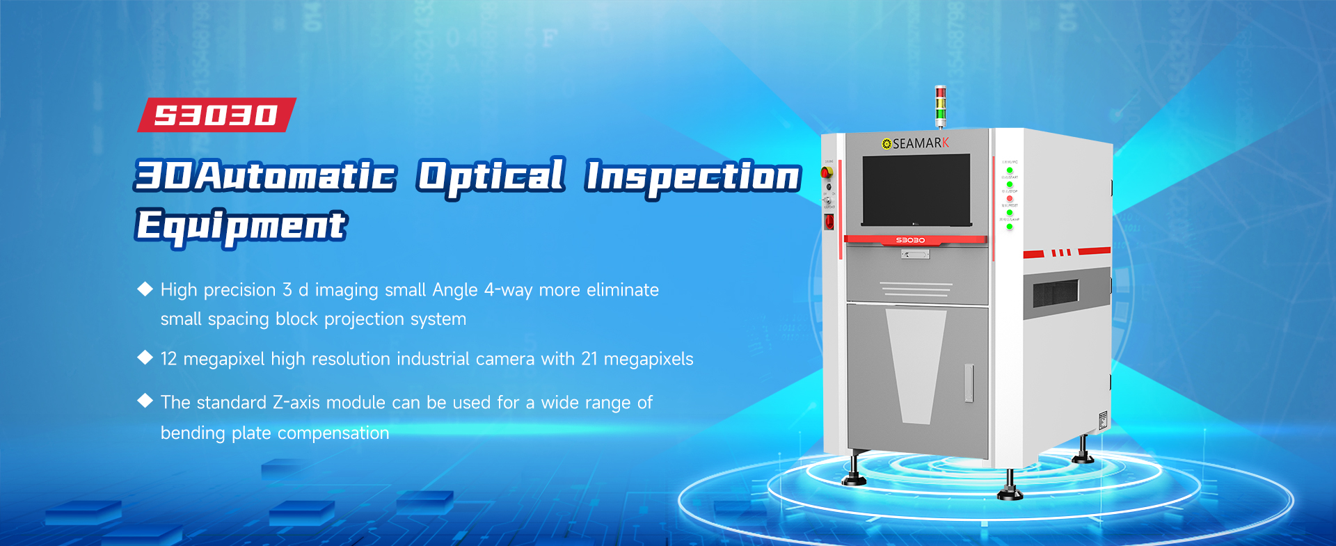 S3030 is a pre-programmed SMT furnace front and back SMT automatic optical inspection equipment, it is equipped with multi angle RGBW light source, 4-channel small angle 3D projection system, high-resolution high-speed camera and telecentric lens, and standard Y-axis gantry dual motor drive. The equipment adopts "2D+3D fusion inspection", which obtains three-dimensional data of components and solder joints through 3D imaging, and combines 2D planar information to achieve all-round inspection, especially suitable for high-density and miniaturized components. It can achieve 3D online automatic optical inspection, which can detect defects such as missing parts, offset, reverse, floating height, side standing, monument standing, poor solder joints, solder beads, oxidation pollution, foreign objects, scratches, etc. on SMT circuit boards.