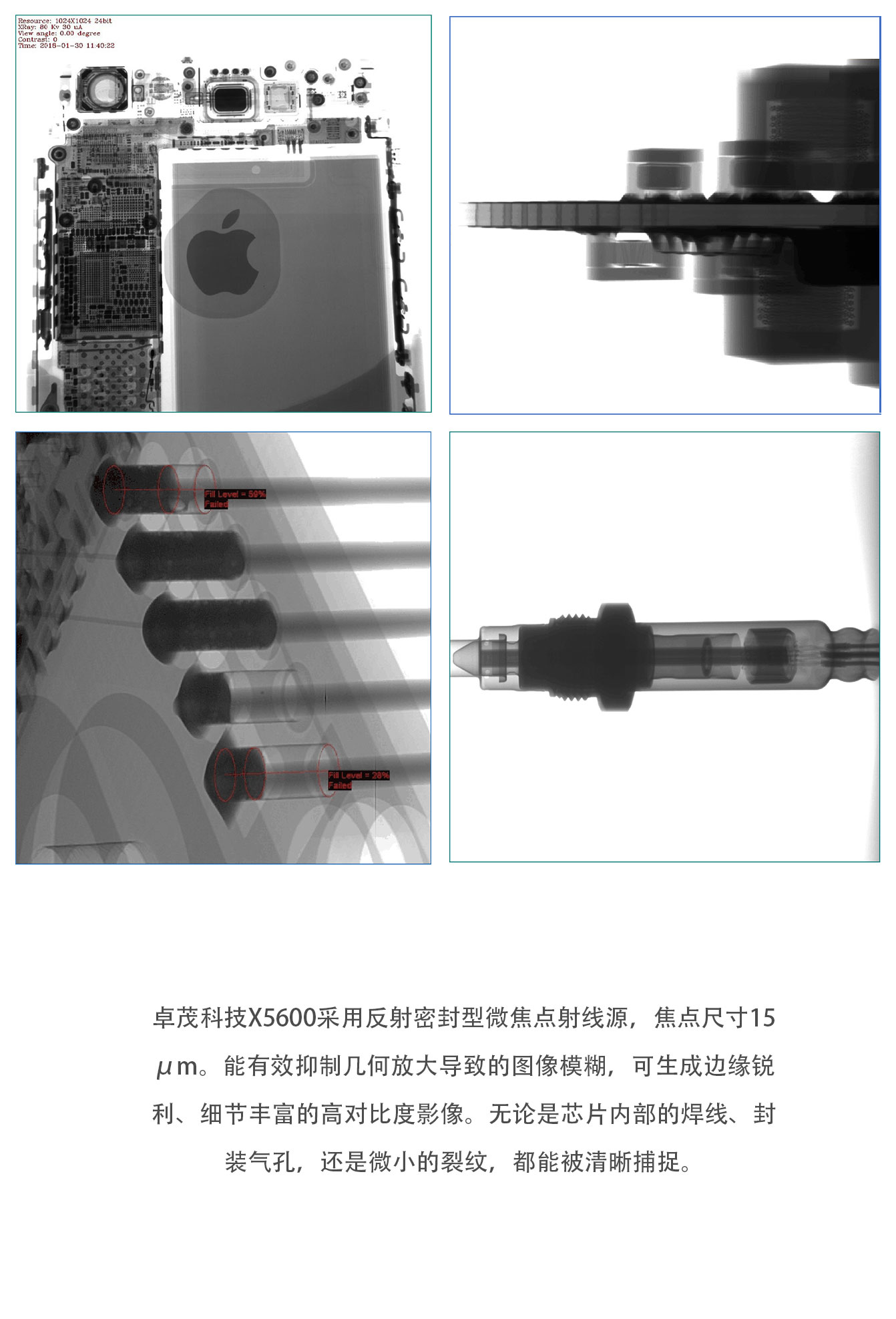 X5600是一款小型精密微焦斑X射线智能检测设备,搭载创新自研智能检测软件及全新一代图像算法,成像更清晰,操作简便,占地空间小,适用于研发实验室、办公室、品检室等场所,是微小精密器件进行X射线检测的首选设备。