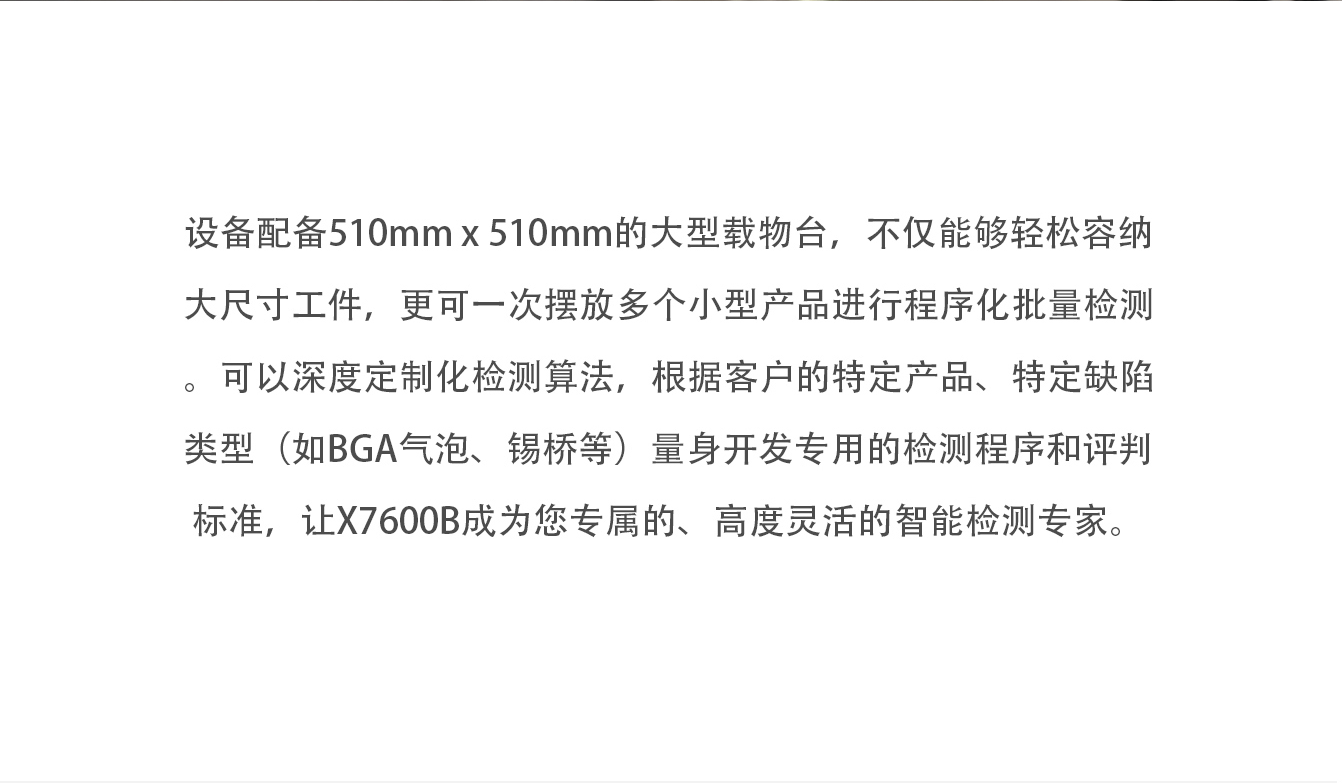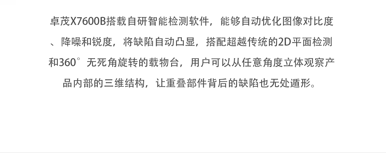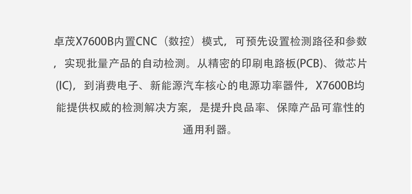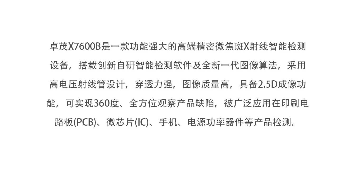 X7600B是一款功能强大的高端精密微焦斑X射线智能检测设备,搭载创新自研智能检测软件及全新一代图像算法,采用高电压射线管设计穿透力强,图像质量高,具备2.5D成像功能,可实现360度、全方位观察产品缺陷,被广泛应用在印刷电路板(PCB)、微芯片(IC)、手机、电源功率器件等产品检测。