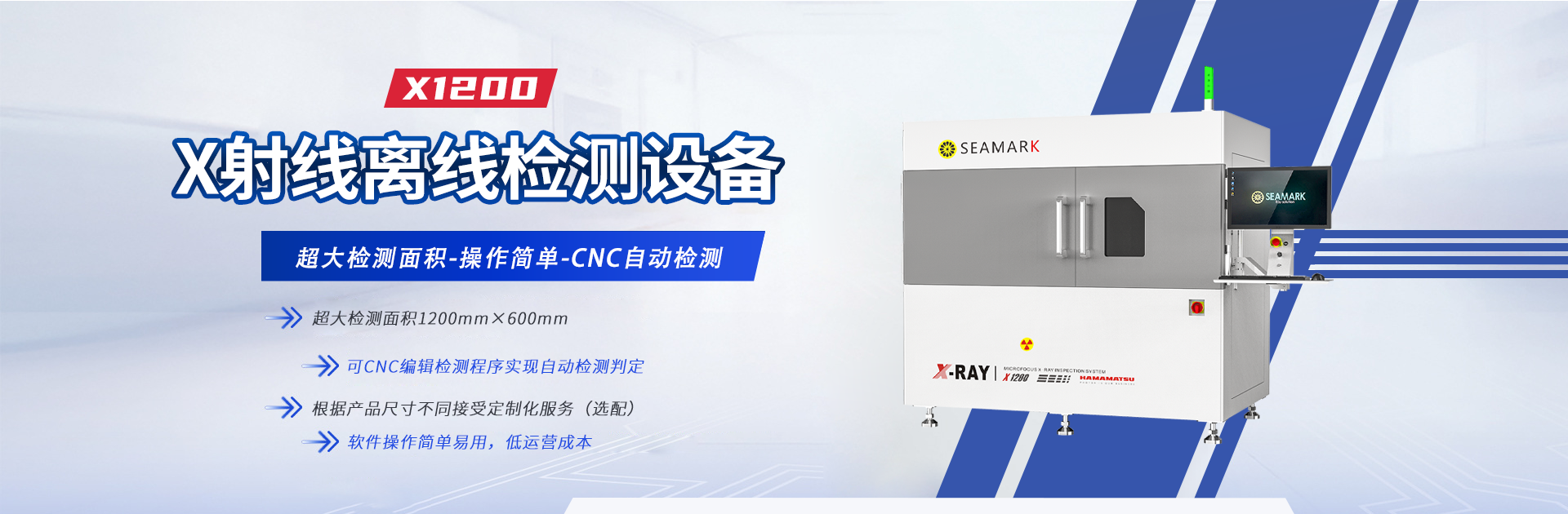 X1200是针对大型PCB板、5G通讯主板、LED灯条等超大面积检测的精密微焦斑X射线检测设备,其有效检测面积可达1200mmx600mm,可实现大范围的自动检测,根据产品尺寸不同接受定制化服务。